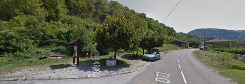 Borne située à gauche sous les arbres du petit square avant l'entrée du village en venant d'Ambérieu