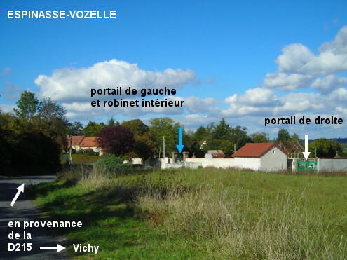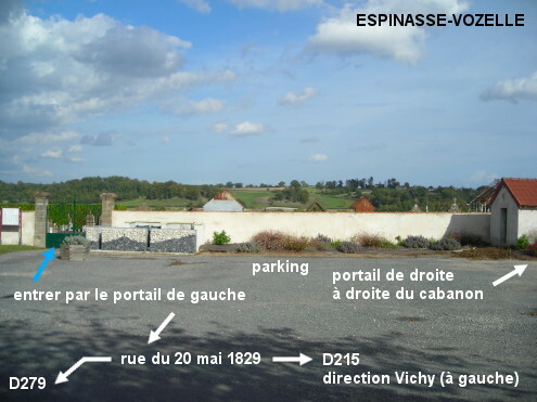 Le cimetière est situé dans une rue en équerre entre la D215 direction Vichy et la D279 direction Vendat. En provenance d'Escurolles sur la D215, ou de Cognat-Lyonne sur la D222, au carrefour avec la D279 direction Vendat, tourner à droite en direction de Vichy (si on arrive de Saint-Pont sur la D222, c'est tout droit), et 340 mètres plus loin tourner dans la première à gauche en suivant la flèche ''cimetière'', pour le trouver un peu plus loin implanté côté droit en retrait par rapport à la route. Entrer par le portail de gauche pour trouver le robinet à l'intérieur à droite de ce portail. P.S. : Quelques mètres plus loin, au carrefour en T tourner à gauche : c'est la suite de la rue du 20 mai 1829 et elle débouche sur la D279 (près d'une école) direction Vendat (à droite). Quand on vient de Vendat sur la D279, au stop près de l'école on ne voit pas la flèche ''cimetière'' qui est orientée pour ceux qui roulent en sens opposé.