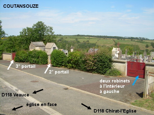 Le cimetière est situé à proximité de l'église. Un duo de robinets se trouve à l'intérieur à gauche du portail le plus à droite. 1) Sur la D118 en provenance de Veauce, 340 mètres après le carrefour avec la D185 et la D284, en direction de Chirat-l'Eglise, on verra l'église érigée côté gauche. Tourner à gauche avant l'église et parcourir 50 mètres jusqu'au premier portail du cimetière que l'on voyait déjà face à soi. C'est à côté de ce portail (il y en a deux autres plus loin sur la gauche) que l'on trouvera à l'intérieur les deux robinets. 2) Sur la D118 en provenance de Chirat-l'Eglise, tourner à droite avant l'église dont on voit l'arrière, pour arriver 50 mètres plus loin, à côté du premier portail du cimetière implanté côté droit.
