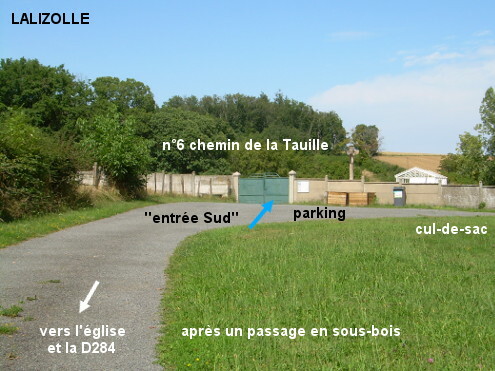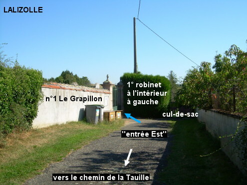 Le cimetière comporte deux entrées, chacune au bout d'une voie en cul-de-sac débutant près de l'église. Sur la D284 en provenance de Coutansouze, tourner à droite après l'église érigée côté droit, 80 mètres plus loin les deux branches du carrefour conduisent chacune à une entrée du cimetière. 1) Si l'on opte pour la branche de droite (il y a une plaque ''Le Grapillon'' sur le bâtiment derrière l'angle), on arrivera 50 mètres plus loin au bout de l'impasse avec sur la gauche ''l'entrée Est''. Le premier robinet est à l'intérieur à gauche de ce portail. 2) Si l'on continue tout droit (chemin de la Tauille) ATTENTION danger : prendre garde de ne pas coincer une roue dans la rigole métallique qui traverse la route en biais avant la partie ombragée en sous-bois. On débouchera ensuite à découvert face à ''l'entrée Sud'' (à 140 mètres de l'embranchement). Le deuxième robinet est à l'intérieur à droite de ce deuxième portail. 3) N.B. : En provenance de la D998, la direction du cimetière est indiquée par deux flèches à partir du carrefour D998 / D284 direction Coutansouze.