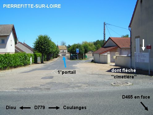 Le cimetière est situé à 110 mètres de la D779, au bout d'une impasse débutant presque en face du carrefour avec la D465 direction Monétay-sur-Loire. Sur la D779 en provenance de Diou, juste avant le carrefour à droite avec la D465, tourner à gauche dans le chemin de la Loire en direction du cimetière et continuer tout droit jusqu'au cimetière en face (devant lequel il y a une grande esplanade). Entrer par le portail en face (celui de droite) pour trouver le robinet sur la droite après le bac à compost.