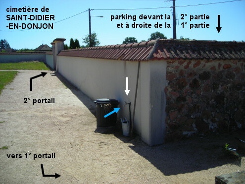 Le cimetière est situé sur la D211 presque en face du carrefour avec la D266 direction Neuilly-en-Donjon. Sur la D211 en provenance du centre du village et en direction de Luneau, juste après l'intersection à droite avec la D266, on verra le cimetière implanté côté gauche. 1) Si l'on entre par le premier portail (celui de gauche), il faut parcourir quelques mètres sur l'allée face au portail puis quelques mètres sur l'allée transverse à droite en direction de la partie plus récente du cimetière, pour trouver le robinet à côté de l'angle à la jonction des deux parties. 2) Si l'on entre par le deuxième portail (celui de droite, situé en retrait par rapport à la route car il y a un parking devant cette partie du cimetière), il faut se diriger aussitôt vers la gauche jusqu'au bout du mur avant de cette nouvelle partie : le robinet est fixé à cet endroit.