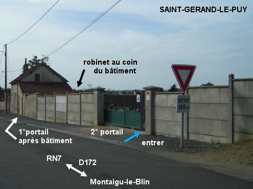 Le cimetière est situé au bord de la D172, non loin du carrefour avec la RN7, à 140 mètres (distance au portail coulissant, donnant l'accès le plus simple au robinet). 1) En provenance de Montaigu-le-Blin, on verra le cimetière côté droit sur la D172. Entrer par le portail situé à côté du panneau annonçant le stop à 150 mètres (au carrefour avec la RN7). Ce portail coulissant est entrouvert pendant les heures d'ouverture du cimetière (de 8h à 19h du 01 avril au 05 novembre, ou de 9h à 17h du 06 novembre au 31 mars). Se diriger vers la gauche (20 mètres sur une épaisse couche de gravillons) jusqu'au grand bâtiment contre le mur avant : le robinet est fixé vers l'angle droit visible depuis le portail. N.B. : Si l'on entre par le portillon à côté du portail principal (le plus proche de la RN7), il faut contourner le bâtiment à droite pour trouver le robinet au dos. 2) A partir du centre du village (en provenance de la D125, et éventuellement auparavant de la D430, D906E ou D60), au carrefour avec la RN7 tourner à gauche sur quelques mètres puis à droite dans la D172 direction Montaigu-le-Blin (il y a aussi une petite flèche ''cimetière'').
