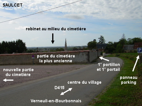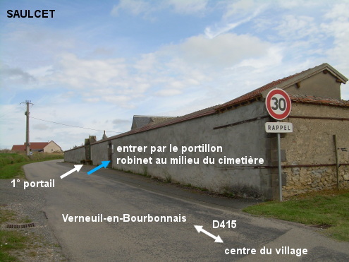 Le cimetière est implanté côté droit à la sortie du village sur la D415 en direction de Verneuil-en-Bourbonnais. Entrer par le portillon qui est directement en bord de route (éloigné du premier portail sur la droite), se diriger vers le portail pour prendre l'allée principale qui est dans l'axe de ce portail afin de trouver le robinet fixé sur une tige au milieu du cimetière (à 30 mètres du portillon). P.S. : La partie en retrait à gauche de la première partie est celle du futur nouveau cimetière, encore vide (en août 2023) et sans robinet.