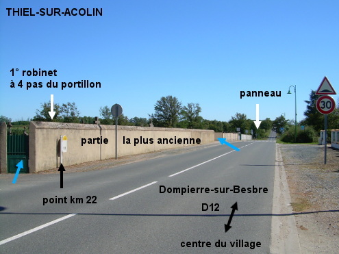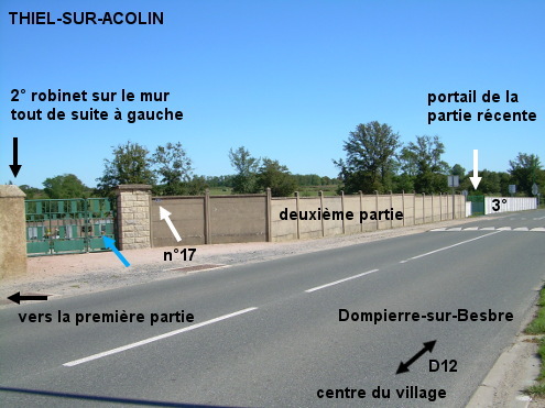 Le cimetière est implanté côté gauche à la sortie du village quand on roule en direction de Dompierre-sur-Besbre sur la D12. Il est composé de trois parties et comporte un robinet dans chacune des deux parties les plus anciennes, celles de gauche. 1) En direction de Dompierre-sur-Besbre sur la D12, peu avant la fin du village on arrivera vers le cimetière implanté côté gauche (au niveau du point kilométrique 22). Ignorer le portail latéral que l'on aperçoit face à un bout de rue oblique, il est en effet verrouillé. Continuer à peine quelques mètres sur la D12 jusqu'au portillon dans le coin au début du cimetière à l'angle avec la rue adjacente à gauche. 1a) Si l'on entre par ce portillon, on trouvera le premier robinet en avançant de quatre pas le long du mur à droite (celui côté D12). N.B. : Avec ce robinet un peu spécial, pour faire couler l'eau il faut appuyer sur l'espèce de poignée vers le bas et vers la buse d'écoulement ou alors serrer en empoignant le tout. 1b) Si l'on continue quelques mètres sur la D12 jusqu'au portail (sis au n°17), on trouvera à l'intérieur le deuxième robinet, un robinet-papillon classique, sur le mur mitoyen des deux premières parties, tout de suite à gauche du portail. 1c) Dans la troisième et dernière partie, beaucoup plus récente, il n'y a actuellement pas de robinet (septembre 2024). 2) En provenance de Dompierre-sur-Besbre sur la D779 (un petit bout) puis la D12, le cimetière est implanté côté droit juste après le panneau de début de village. Ignorer le portillon sur le mur latéral droit, de même que le premier portail que l'on verra côté D12 : ils donnent dans la partie la plus récente qui n'a pas encore de robinet. Continuer quelques mètres jusqu'au portail suivant, sis au numéro 17, pour trouver un robinet à l'intérieur tout de suite à gauche.