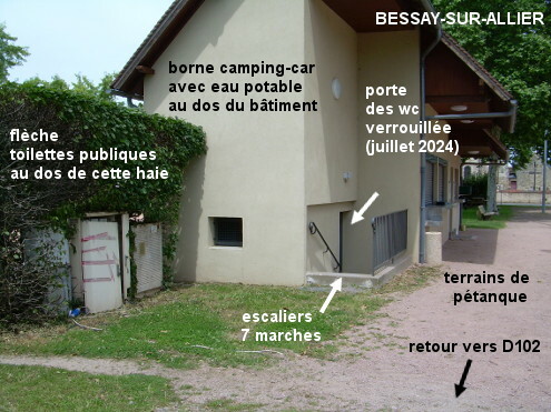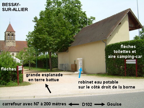 L'aire pour camping-car est située au bord de la D102 direction Gouise. 1) En provenance de La Ferté-Hauterive, la D300 après le rond-point et après avoir franchi le pont sur la voie ferrée rejoint la N7 en centre-ville. Tourner à droite et plus loin tourner à gauche dans la D102 direction Gouise. Environ 200 mètres plus loin entrer à gauche sur l'aire pour camping-car fléchée pour trouver aussitôt sur la droite la borne blanche avec les robinets, au dos d'un bâtiment. N.B. : Le robinet qui délivre de l'eau potable (comme mentionné par écrit) est celui qui nous fait face quand on entre sur la grande esplanade et qui est sur le côté droit de la borne. PS.1 : Il y a aussi deux flèches ''toilettes publiques'', probablement celles qui sont au sous-sol du bâtiment au dos duquel est implantée la borne et en regard d'une deuxième esplanade de l'autre côté de la haie. La porte de ces toilettes était toutefois verrouillée (début juillet 2024). P.S. 2 : En traversant toute la première esplanade en terre battue, on arrive à côté du cabinet médical qui est au bord de la place de l'église à côté de laquelle il y a les toilettes du centre socio-culturel situé face à l'église. 2) Sur la D102 en provenance de Gouise, après les terrains de football côté gauche, surveiller le côté droit de la route et juste après le square de la Liberté, entrer à droite (derrière la courte haie perpendiculaire) sur l'autre esplanade en suivant la petite flèche ''aire camping-car''. La borne avec le robinet est alors immédiatement à droite.