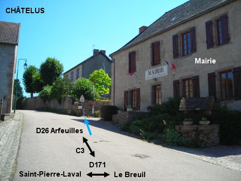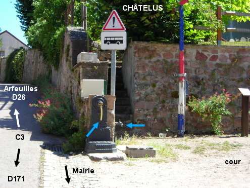Ces deux robinets sont situés à gauche de la Mairie sur la petite route qui rejoint la D26 direction Arfeuilles. Sur la D171 en provenance de Saint-Pierre-Laval, tourner à gauche en direction d'Arfeuilles (on peut aussi prendre la suivante à gauche en face du château, elles se rejoignent sur la place à côté de l'église). Au carrefour en T à côté de l'église érigée côté gauche, tourner à gauche. La Mairie est implantée côté droit peu après. Les deux robinets se trouvent à gauche de la cour qui est à gauche de la Mairie, sous un panneau de signalisation triangulaire annonçant un arrêt de car. Le premier est un robinet sur vasque (doté d'un bouton bizarre) installé au bout du petit pan de mur parallèle à la route, et le deuxième (plus classique) est au dos de ce pan de mur, côté cour. P.S. : En face de l'église, de l'autre côté de la place, il y a des vieilles toilettes sans robinet.