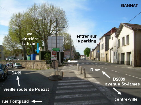 Ces toilettes se trouvent dans la pointe d'un parking situé à l'angle de la D2009 en direction de Riom (route à très grande circulation) et de la ''vieille route de Poëzat''. Il s'agit d'anciennes toilettes de type vespasienne dont l'intérieur a été refait à neuf. N.B. : Le lavabo dans la cabine WC est relativement petit, par contre il y a un robinet à droite de l'urinoir dans la partie droite des toilettes. 1) En provenance de Mazerier sur la D37, au premier rond-point elle rejoint la D2009, continuer tout droit en direction du centre-ville. Au deuxième rond-point deux options sont possibles. 1a) Suivre la direction de Riom pour les voitures donc continuer tout droit et peu après continuer encore tout droit dans la rue en sens unique pendant un long moment, franchir le petit pont sur la rivière et continuer en face dans la D2009 direction Riom (avenue Saint-James). Environ 140 mètres plus loin, juste après une rue adjacente à gauche et la fourche entre la rue oblique et la D2009 entrer à gauche sur le parking de la place Saint-James arborée pour trouver les toilettes dans le coin à gauche. 1b) Suivre la direction Riom pour les plus de 3,5 tonnes en tournant à droite et continuer tout droit pendant un long moment jusqu'à un stop. Là tourner à droite, franchir le pont sur la rivière et continuer tout droit dans la D2009 direction Riom (avenue Saint-James) puis idem ci-dessus. P.S.1 : La rue oblique qui borde l'autre côté de la place Saint-James rejoint plus loin la D419 en direction de Poëzat (au carrefour en rase campagne passer sous le pont sous la voie ferrée à gauche, ensuite au stop du carrefour en T, c'est la D419 et la direction de Poëzat est à droite). P.S.2 : Si on prend la rue Fontpaud, on rejoint plus vite la D419 direction Poëzat. 2) En provenance de Saulzet sur la D37, au rond-point tourner à gauche (il n'y pas de signalisation, mais c'est l'ex-RN9) puis suivre la direction de Clermont-Ferrand : au rond-point à droite, plus loin longer la rivière (qui est à droite) puis suivre le virage à gauche pour entrer dans l'avenue Saint-James.