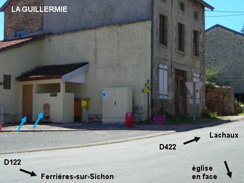 Les toilettes sont situées presque en face de l'église, à l'angle de la D122 et de la D422 direction Lachaux. Sur la D122 en provenance de Ferrières-sur-Sichon, on verra l'église côté gauche et sur le côté droit le premier carrefour avec la D422. Le bâtiment des toilettes est situé sur la droite de la placette sise derrière la D422 direction Lachaux. N.B.: En plus du lavabo dans la cabine WC, il y a un robinet extérieur sur vasque (surmonté d'un écriteau ''eau potable'') à droite de la porte des WC.