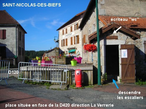 Les toilettes se trouvent au bord d'une place le long de la D120, presque en face du carrefour sud avec la D420. Sur la D120 en provenance du col de la Rivière Noire, presque en regard de la D420 qui part à gauche en direction du plateau de La Verrerie, on verra sur la droite une grande place, puis au bord de ladite place et face à nous, le petit bâtiment des toilettes qui sont situées en sous-sol après huit marches d'escalier en quart de cercle (pas de difficulté d'accès). N.B. : De l'autre côté de la route, il y a une fontaine qui s'écoule dans un grand bassin en pierre rectangulaire avec dosseret. AVERTISSEMENT : Il n'y a pas d'écriteau se rapportant à la potabilité de l'eau, mais on peut supposer que si elle n'était pas consommable, ce serait précisé. Cela a d'ailleurs été le cas temporairement (il y avait eu un écriteau ''non potable'' qui a ensuite été retiré), donc vérifiez bien le jour de votre passage qu'il n'y a pas d'interdiction d'en boire. Elle peut au moins servir à se rafraîchir en cas de grosses chaleurs.