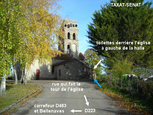 Les toilettes se trouvent derrière l'église visible depuis la D223. Sur la D223 en provenance de Bellenaves, 90 mètres après le carrefour avec la D483, tourner à gauche dans la rue qui dessert l'église et qui en fait le tour. Passer à droite de l'église pour trouver côté droit le petit bâtiment des toilettes (à 80 mètres de la D223) accolé à un grand bâtiment et à gauche d'une halle. N.B. : Le lavabo est trop petit pour remplir un bidon, mais il y a un robinet entre le lavabo et le mur à sa gauche, un peu en-dessous du lavabo.