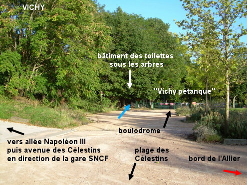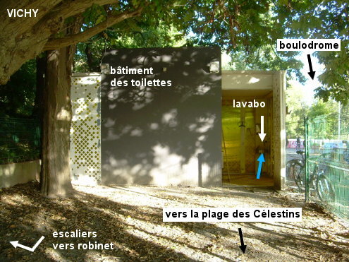 Ces toilettes (les seules de la ville ayant de l'eau potable) se trouvent dans un recoin à gauche du boulodrome ''Vichy pétanque'' situé dans le parc du Soleil au bord de l'Allier près de la plage des Célestins et sont accessibles en passant par l'allée piétonne ''avenue Napoléon III'' qui est dans le prolongement de l'avenue des Célestins qui conduit à la gare SNCF. 1) Au sortir de la gare SNCF, prendre à gauche l'avenue des Célestins jusqu'au carrefour en T 970 mètres plus loin. Entrer alors sur l'allée piétonne en face (avenue Napoléon III, asphaltée). Continuer au-delà de la croisée avec deux allées piétonnes (chemin en terre à gauche, allée asphaltée à droite) pour descendre plus près des bords du fleuve. Là, à 80 mètres de la route, on voit à droite la plage des Célestins dans le parc Kennedy, et sur la gauche les terrains clôturés de pétanque dans le parc du Soleil. Parcourir 40 mètres sur la terre battue pour trouver les toilettes à gauche, entre les arbres et les terrains de pétanque au fond sous les arbres (à l'extérieur de la zone clôturée). N.B. : Les escaliers situés à gauche avant le bâtiment des toilettes montent vers un robinet mais il est plus pratique de contourner les 17 marches et de passer par le chemin en haut. 2) Au sortir du pont sur l'Allier en provenance de Bellerive-sur-Allier, tourner à droite en direction de la gare SNCF dans le boulevard du Président John Kennedy qui longe une suite de parcs arborés. Environ 480 mètres plus loin, au carrefour à gauche avec la direction de la gare SNCF (la première flèche sur le poteau est celle bleue de l'A89), entrer à droite sur l'allée piétonne (avenue Napoléon III) puis idem ci-dessus.