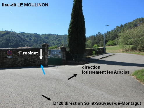 Le cimetière (fléché) est situé dans une rue secondaire débutant près de la sortie du lieu-dit sur la D120 direction Saint-Sauveur-de-Montagut (commune à laquelle ce lieu-dit est rattaché). 1) En provenance de Saint-Sauveur-de-Montagut sur la D120, juste après le panneau marquant le début du lieu-dit, tourner à droite en direction du cimetière (carrefour en Y). Monter jusqu'au cimetière (pente 11%) pour arriver entre deux courbes face au portail du cimetière implanté à gauche de la rue. 1a) Le premier robinet est à l'extérieur à gauche du portail. 1b) En cas de problème, on peut aller voir le deuxième robinet : entrer et avancer de 70 mètres sur l'allée asphaltée jusqu'à la deuxième partie du cimetière, pour trouver le deuxième robinet côté gauche au dos du pan de mur de séparation. 2) En provenance des Ollières-sur-Eyrieux sur la D120, traverser tout le lieu-dit (relativement long) puis peu avant le panneau de fin, tourner en épingle à gauche en direction du cimetière et monter jusqu'au cimetière.