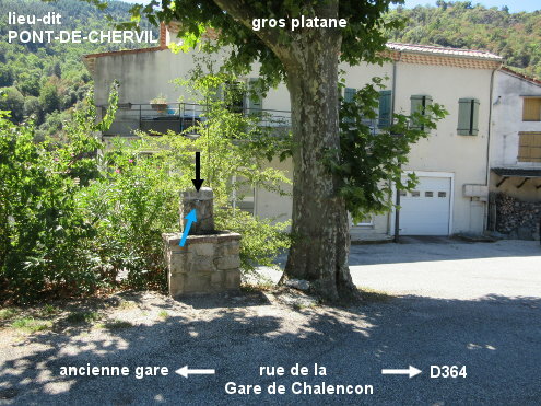 Le robinet de ce lieu-dit rattaché à la commune de Chalencon, se trouve au tout début de la rue menant à l'ancienne gare de Chalencon (cf flèche ''La Gare'') tout près de son carrefour avec la D364 direction Chalencon. Il est fixé sur un grand support en pierres construit à côté d'un gros platane qui est à l'angle. 1) Sur la D120 en provenance du Cheylard (suivre la direction de Privas), tourner à gauche dans la D364 en direction de Chalencon. Juste après le pont sur l'Eyrieux, tourner à droite en suivant les flèches ''La Dolce Via'' et celle indiquant l'aire de pique-nique et le parking de la gare. Derrière ce carrefour il y a un abribus et dans l'angle avant (dans la fourche avec l'allée desservant une propriété privée) il y a un platane qui cache le support du robinet. Avancer d'à peine deux mètres dans cette rue pour trouver le robinet tout de suite après le platane. 2) En provenance de Chalencon (suivre la direction de Saint-Sauveur-de-Montagut) sur la D364, peu après l'intersection avec la Voie Verte ''Dolce Via'' qui est située juste avant le panneau marine de début de lieu-dit, tourner à gauche après l'abribus. On trouvera alors le robinet côté droit et à gauche du platane.