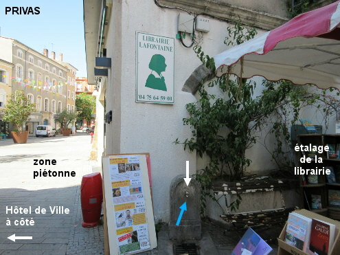 Ce robinet se trouve à gauche de l'Hôtel de Ville (doté d'un beffroi visible de loin) sis dans une zone piétonne en centre-ville (suivre le fléchage ''Préfecture'' pour s'en approcher). Il est fixé sur un support dosseret en pierre contre le mur d'un bâtiment vers un coin occupé actuellement (août 2025) et en journée par l'étalage d'une librairie. 1) En provenance du col du Benas sur la D7, rouler toujours tout droit puis quand on arrive face à un sens interdit pile dans l'axe, suivre le sens obligatoire et prendre à gauche la première rue parallèle (rue du Foirail) bordée à gauche par un parking. Ensuite, au carrefour continuer tout droit dans le ''sens interdit sauf vélos'' (rue Croix du Roure). Au stop tourner à droite, c'est la D104. Au rond-point continuer tout droit sur la deuxième sortie en direction de la Préfecture (D104). Juste après ce rond-point, ignorer la première à gauche qui est une rue piétonne, tourner dans la suivante juste devant l'Office de Tourisme (rue Pierre Filliat). Dépasser la Préfecture sise côté gauche et suivre le sens obligatoire à gauche faisant passer sous le bâtiment. Au débouché de cette arche sur un carrefour en T (dominé par le beffroi de l'Hôtel de Ville dont on voit l'arrière), prendre la rue piétonne en face pour trouver le robinet à quelques pas en face, devant le pignon d'un bâtiment décalé qui créé un coin côté droit. P.S.1 : En repartant, prendre la rue Bir Hakeim qui était à droite au sortir de l'arche pour ensuite déboucher sur la D2 direction Les Ollières-sur-Eyrieux (à gauche). 2) En provenance des Ollières-sur-Eyrieux sur la D2, après l'angle droit qu'elle fait vers la gauche, un peu après et dans le virage à droite tourner encore plus à droite en direction de la Préfecture (boulevard de Vernon). Longer une partie des bâtiments de la Préfecture sis côté droit puis passer tout droit dans l'arche sous le bâtiment afin de trouver ensuite le robinet comme en fin du point 1. P.S.2 : Compte tenu des rues en sens unique, le plus simple est de retourner sur la D2 en prenant la rue Bir Hakeim comme en P.S.1.