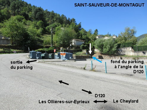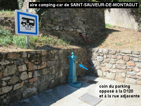 L'aire pour camping-car est implantée dans un coin d'un long parking rectangulaire situé à l'angle de la D120 et d'une rue adjacente qui débute à côté d'un supermarché. Le robinet est fixé sur un support vert situé à 80 mètres de la D120 dans le coin opposé au carrefour. 1) En provenance des Ollières-sur-Eyrieux sur la D120, juste après le supermarché sis côté gauche dans l'angle de la première rue adjacente, tourner dans ladite rue et monter jusqu'à la sortie du parking aménagé côté droit. À vélo et en étant prudent, on peut passer en contresens par la sortie du parking pour accéder au robinet qui est alors sur le côté gauche un peu plus loin. 2) En provenance du Cheylard sur la D120, après les carrefours à droite avec la D230 (une flèche ''Gluiras'' est implantée côté gauche) puis avec la D102 venant de Mézilhac (rond-point plat), un moment après ce dernier, juste après un arrêt de bus entrer à droite sur le parking perpendiculaire aménagé dans l'angle avec la première rue adjacente derrière laquelle il y a un supermarché. Se diriger vers le fond et le coin à droite de ce parking rectangulaire (dont le petit côté est celui au bord de la D120) pour trouver le robinet sur son support accompagné du panneau avec le pictogramme camping-car.
