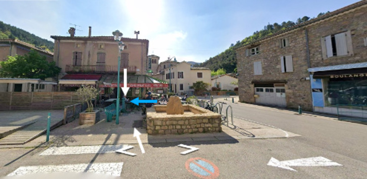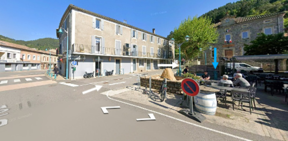 Ce robinet, fixé sur un support carré vert ressemblant à une borne, se trouve sur la place sise devant la Mairie (et dont une partie est occupée par la terrasse d'un café), située au bord de la D102 près du mini rond-point avec la D120. 1) En provenance de Mézilhac et d'Albon-d'Ardèche sur la D102, rejointe juste avant le panneau marquant le début de la ville par la D211 venant à droite du col de Tauzuc, puis peu après par la D244 venant à droite de Saint-Étienne-de-Serres, juste après le panneau annonçant le rond-point (avec la D120) tourner dans la rue adjacente à droite et entrer aussitôt à droite sur la petite place qui est dans l'angle et au fond de laquelle il y a la Mairie. On trouvera le robinet sur son support au milieu de cette place, dont une partie est occupée par la terrasse d'un bar-restaurant. 2) En provenance des Ollières-sur-Eyrieux et du lieu-dit Le Moulinon sur la D120, au mini rond-point tourner à gauche (deuxième sortie) dans la D102 en direction de Mézilhac. À peine quelques mètres après, tourner à gauche devant la place qui est derrière le carrefour avec cette rue adjacente. Entrer sur cette place par son côté pour trouver le robinet au milieu à quelques pas.