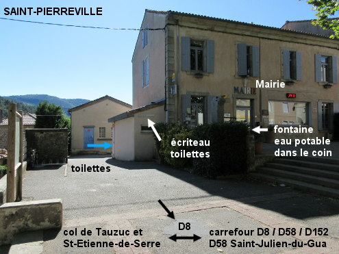 Les toilettes sont accolées à gauche de la Mairie sise sur une place située au bord de la D8 près du carrefour D8/ D58 / D152. 1) Sur la D8 en provenance de Saint-Étienne-de-Serre et du col de Tauzuc, on arrivera vers une longue place avec parking côté gauche. Vers son milieu, juste après l'obélisque du Monument aux Morts, prendre la deuxième allée, celle qui est après l'arbre et juste avant la Mairie. Avancer jusqu'au petit bâtiment accolé à gauche de la Mairie et en un peu contrebas de celle-ci, une pancarte signale que ce sont les toilettes. N.B.1 : En plus de deux lavabos, il y a un robinet supplémentaire. 2) En provenance d'Albon-d'Ardèche sur la D102 puis la D152, au carrefour en T avec la D58 qui arrive à droite de Saint-Julien-du-Gua et avec la D8, tourner à gauche dans la D8 en direction de Saint-Étienne-de-Serre (sans S final d'après le site officiel www.commune-mairie.fr, il y a une erreur sur cette flèche). Quelques mètres après on sera au début de la longue place sise côté droit sur laquelle il y a la Mairie derrière un parvis piéton situé au milieu de ladite place. N.B.2 : À l'angle juste avant cette place et au bord de la route il y a une première fontaine dont l'eau est signalée comme non-potable. N.B.3 : Au milieu de cette place et devant la Mairie (dans le coin gauche du parvis piéton en léger surplomb d'une allée), il y a une deuxième fontaine qui est quant à elle accompagnée d'un écriteau ''eau potable'', l'eau était toutefois coupée (fin août 2025, en raison de restrictions pour cause de sécheresse). Juste après la Mairie, entrer à droite sur l'allée en contrebas de celle-ci pour accéder aux toilettes qui sont à gauche de la Mairie.