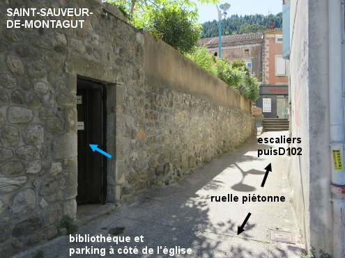 Ces toilettes se trouvent dans une ruelle piétonne à proximité de la bibliothèque (fléchée) et de l'église érigée au bord de la D102 direction Mézilhac et près du carrefour D102 / D120. 1) En provenance de Mézilhac sur la D102, tourner à gauche devant l'église en suivant une flèche ''parking''. Se diriger vers la droite puis presque en face de la bibliothèque sise côté gauche, prendre à droite la ruelle piétonne entre un mur et un bâtiment, pour trouver les toilettes à son début côté gauche (à 70 mètres de la D102). 2) En provenance des Ollières-sur-Eyrieux sur la D120, tourner à gauche dans la D102 direction Mézilhac (deuxième sortie d'un rond-point plat) puis s'arrêter 55 mètres après, à la fin d'un petit parking (un bâtiment avant l'église) et en suivant la flèche ''bibliothèque'' descendre à droite cinq marches d'escaliers pour trouver l'entrée des toilettes côté droit (à 15 mètres de la D102) dans le mur de la placette sise au bord de la D102.