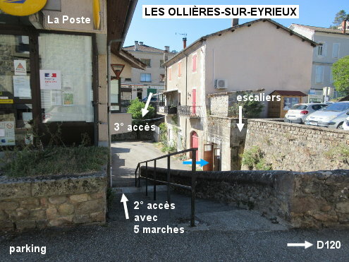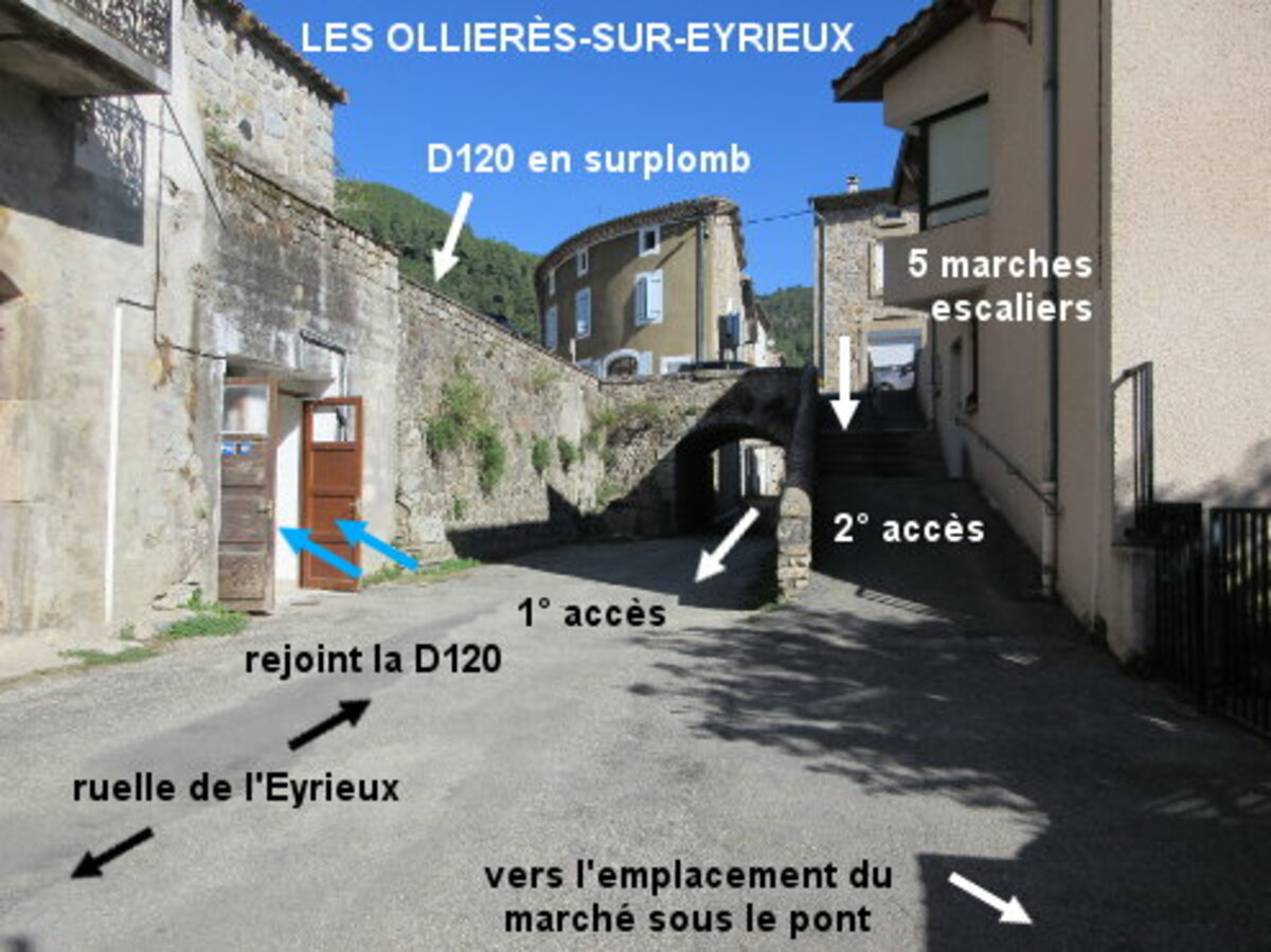 Ces toilettes se trouvent en contrebas de la D120, à proximité du bureau de Poste sis à côté de la D120. 1) Sur la D120 en provenance de Saint-Sauveur-de-Montagut, au carrefour avec la D2 qui arrive en face de Privas, tourner à gauche en direction du centre-ville. 1a) Tourner dans la première à gauche puis passer sous l'arche. Peu après celle-ci et juste après des escaliers montant à droite vers la placette sise au bord de la D120, on verra les deux portes des toilettes dans le mur de soutènement (à 120 mètres de la D120). N.B. : Les toilettes sont composées d'une partie ''hommes'' (porte de gauche) et d'une partie ''dames'' (porte de droite) ayant chacune un lavabo. 1b) Si on a loupé le début de la ruelle, ou si l'on arrive en sens inverse, lorsque l'on verra le bureau de Poste, rejoindre celui-ci pour emprunter la rampe piétonne qui descend vers la ruelle en contrebas (attention : il y a cinq marches d'escaliers au milieu de cette rampe !). En bas, on sera à côté des portes des toilettes (à 40 mètres de la D120). 1c) Il existe un troisième accès à la ruelle dans laquelle se trouvent les toilettes : après le bureau de Poste et après le bâtiment qui est dans l'angle du virage à gauche, il y a une étroite rampe asphaltée piétonne en arc de cercle fléchée ''marché'' (l'emplacement de celui-ci est situé sous la première arche du pont, en sens opposé aux toilettes). En bas de cette rampe, prendre à gauche la ruelle pour trouver les toilettes peu après côté gauche. 1d) Le quatrième accès par les escaliers étroits entre le parking de La Poste et les toilettes n'est pas pratique pour un cycliste même à pied. 2) En provenance de Dunière-sur-Eyrieux, après le carrefour à droite avec la D2 venant de Saint-Michel-de-Chabrillanoux (la D2 et la D120 se superposent dans une grande partie du village), après le pont sur l'Eyrieux et juste après le virage à droite, entrer à droite sur la placette sur laquelle il y a le bureau de Poste. Puis descendre la rampe vers la ruelle en contrebas pour trouver les toilettes comme au point 1b.