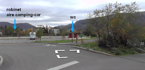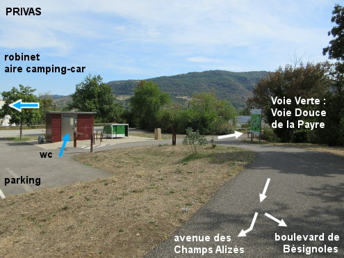 Ces toilettes et le robinet de l'aire camping-car (fléchée, à partir de la D7) se trouvent sur le parking situé à l'emplacement de l'ancienne gare et à l'extrémité de la Voie Verte ''Voie Douce de la Payre'' qui relie Le Pouzin à Privas. 1) Sur la D7 en provenance de Berzème et du col du Benas, rouler tout droit et surveiller le côté gauche de la route. Environ 650 mètres après le panneau de début de ville, on peut rejoindre à gauche la Voie Verte et suivre l'itinéraire du point 2. Sinon, 1 km après ce panneau, repérer côté gauche celui avec le pictogramme camping-car et sa flèche qui pointe vers la droite. Tourner alors à droite dans la rue qui descend (boulevard de Bésignoles). Ensuite derrière la rue adjacente à gauche on verra le grand parking avec la Voie Verte qui arrive de la droite et sur la gauche l'entrée dudit parking pour les véhicules. 1a) Le petit bâtiment des toilettes est implanté sur la droite du parking près du débouché de la Voie Verte avant qu'elle ne rejoigne la route. Il s'agit d'une cabine WC autonettoyante dotée d'un lavabo-boite tri-fonction avec cellule à détection pour la commande de l'écoulement de l'eau (N.B. : Un bidon de 500 ml passe juste sous le jet). 1b) L'aire service pour camping-car est à droite du panneau avec le pictogramme ad-hoc (que l'on pouvait apercevoir de loin si la vue est bien dégagée) implanté au fond de la partie gauche du parking et presque en face de son entrée. Le robinet fileté pour le remplissage des cuves de camping-car est fixé sur le côté gauche du bloc carré en ciment et est accompagné d'un pictogramme signifiant ''eau potable''. Sa sortie est à l'horizontale et l'eau gicle, ce qui n'est pas très pratique, mais l'autre robinet côté droit n'est destiné qu'au rinçage des cassettes wc de camping-car. 2) Sur la Voie Verte ''Voie Douce de la Payre'' (à l'emplacement de l'ancienne voie ferrée, qui longe la rivière éponyme affluente du Rhône et rejoint la ''Via Rhôna'') en provenance du Pouzin et d'Alissas, on arrivera sur le côté du parking de l'aire pour camping-car. À cet endroit la branche gauche rejoint la route, tandis que la branche tout droit donne sur le côté de la cabine WC et sur le parking. P.S. : On peut rejoindre la D7 soit en montant le boulevard de Bésignoles (flèche itinéraire conseillé camping-car) soit en prenant à droite l'avenue des Champs Alizés. Puis en empruntant les ''sens interdit sauf vélos'', on arrivera en centre-ville à un stop au carrefour avec la D104 qui rejoint à droite la D2 direction Les Ollières-sur-Eyrieux.