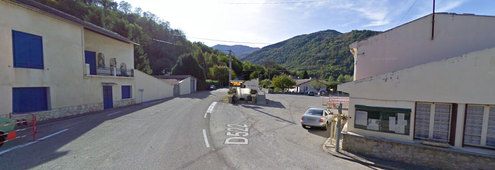 Des toilettes se trouvent derrière un panneau d'affichage lumineux, à proximité de la mairie, place des platanes, au pied de l'ascension du plateau de beille.