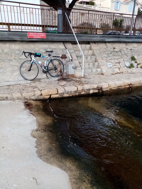 En venant des chantiers navals suivre la mer,( à environ à 800 mètres du port principal) il y a ce petit port en contre bas, c'est un peu barricadé, mais il y a un petit passage, la borne n'est pas d'hier mais il y avait de l'eau