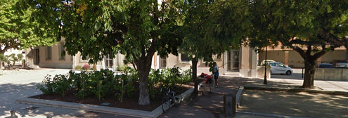 Une borne se trouve sous les arbres sur la place devant la mairie.