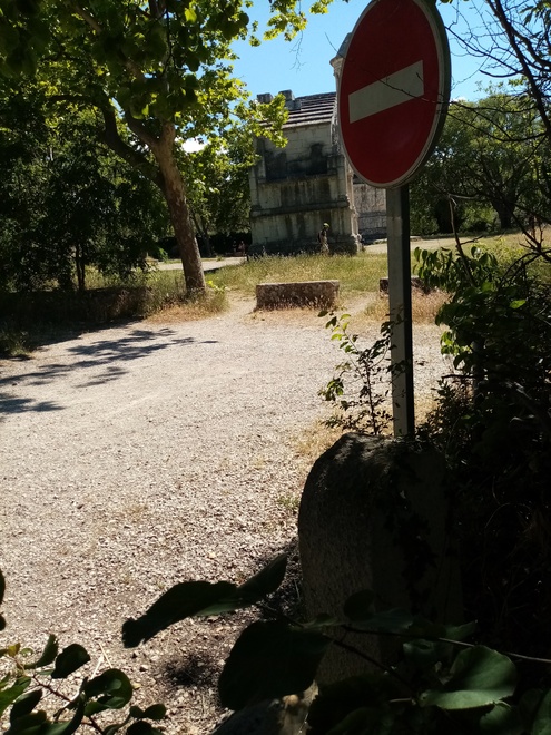 dommage que l'on ne puisse pas mettre plusieurs photos on voit la borne dans l'ombre, j'ai voulu que l'on voit le monument pour mieux se repérer, il y a ce panneau sens interdit d'ailleurs je ne sais pas trop à quoi il sert, malheureusement cette borne ne date pas de l'époque gallo romaine,en descendant à St Rémy on rejoint la piste cyclable et l'EURO vélo 8 à gauche on peut partir sur le pont du gard et rejoindre une autre piste cyclable aprés Tarascon à droite une autre piste cyclable de Cavaillon jusqu'à aprés Apt tout cela est trés sympa à faire