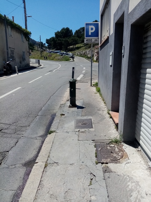 à la sortie du hameau sur le trottoir sur la droite direction les Goudes juste avant d'attaquer le raidillon juste avant le parking des bus sur la droite