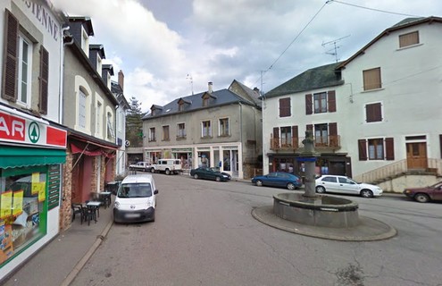 Fontaine au centre d'une petite place, devant un magasin "Spar" et une pharmacie.