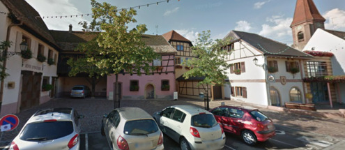 Toilettes au fond de la petite place/parking au 70 rue Herzog. Panneau "WC public" au-dessus de la porte.