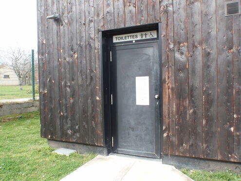 WC Publics auto-nettoyants rue du Stade, au dessus du terrain de hand-ball, près du stade et du collège Alain Savary.