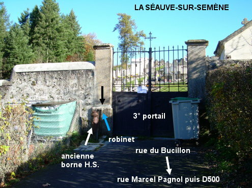 Le cimetière (fléché) est situé à 430 mètres de la D500 dans une rue secondaire qui monte avec une pente moyenne de 10%. Il comporte deux parties et deux portails donnant sur cette rue, et un troisième portail sur une autre rue. Le premier robinet est à l'intérieur d'un cagibi accessible depuis l'extérieur et situé à côté du portail de gauche. 1) En provenance de Saint-Didier-en-Velay sur la D500, longtemps après le début du village, quand on verra sur un portique au-dessus de la route un panneau triangulaire ''attention piétons, sortie école'' tourner à droite en direction de l'église et du cimetière (les petites flèches parmi une série, ont bruni et sont peu lisibles). Le début de la rue monte légèrement puis après l'église en retrait sur une place côté droit, la pente s'accentue. 1a) Monter jusqu'au cimetière implanté côté gauche à l'entrée d'un virage à droite. Le portail le plus proche est celui qui donne dans la partie la plus ancienne. À l'extérieur à sa droite, il y a une borne incendie puis la porte ouverte d'un cagibi sombre à l'intérieur duquel il y a un robinet pile en face de la porte. N.B.: Si on s'est trompé en bas et qu'on a tourné trop tôt en suivant la flèche du parking de l'église, au premier carrefour en T tourner à gauche puis au suivant à droite, et ensuite monter tout droit jusqu'au cimetière. 1b) Dans la montée vers le cimetière on peut tourner à gauche dans un carrefour en Y dans la fourche duquel il y a une borne incendie rouge puis rouler jusqu'au bout de cette rue du Bucillon en impasse pour arriver en face du troisième portail du cimetière en ayant économisé 25 mètres de dénivelé et 40 mètres de roulage. On trouvera alors le deuxième robinet à l'extérieur à gauche du portail et derrière une vieille borne hors service. 2) En provenance de Sainte-Sigolène sur la D43 puis la D500, après le rond-point D500 / D12 (prendre la première sortie) on verra au-dessus de la route un panneau ''attention piétons'' sur un portique. C'est là qu'il faut tourner à gauche dans la rue qui monte en direction du cimetière.