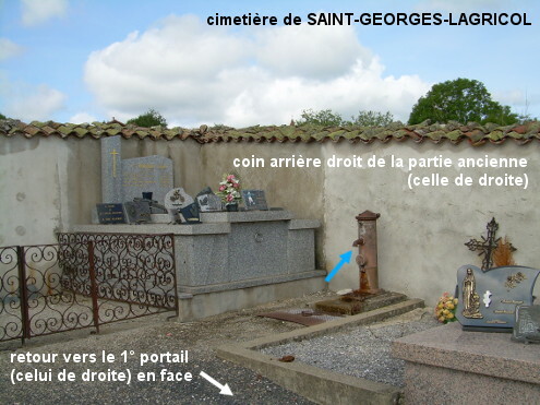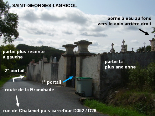 Le cimetière est situé dans une rue secondaire à 260 mètres du carrefour D26 / D352. En provenance de Saint-Julien-d'Ance sur la D352, au carrefour avec la D26 dont le tronçon de gauche passe dans le centre du village (et continue en direction de Vorey-sur-Arzon), tourner en épingle dans la rue à gauche devant l'obélisque du Monument aux Morts (rue de Chalamet qui se prolonge en route de la Branchade). Rouler tout droit jusqu'au cimetière implanté côté droit. Entrer par le premier portail (portail de droite qui donne dans la partie la plus ancienne), puis monter dans l'allée gravillonnée jusqu'au coin arrière droit pour trouver la borne à eau contre le mur droit juste avant la dernière tombe (à 30 mètres à peine du portail). N.B. : Il faut actionner longtemps la molette droite de cette borne toute rouillée pour faire couler l'eau.