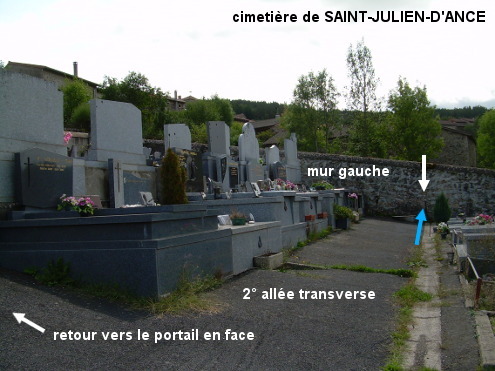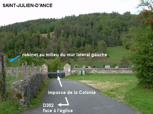 Le cimetière est situé au bout d'une impasse débutant en face de l'église et à 120 mètres de la D352. Le robinet est à l'intérieur du cimetière au milieu du mur latéral gauche à 30 mètres du portail. En provenance de Saint-Georges-Lagricol sur la D352, en face de l'église érigée côté droit dans un virage de la D352, tourner à gauche dans la place, à droite de laquelle il y a une obélisque et une fontaine dont l'eau est non-potable, et d'où partent trois rues. Ignorer la rue à droite et la rue à gauche, prendre la rue en face, dont le début est très étroit coincé entre deux bâtiments. Aller jusqu'au bout de cette impasse pour arriver face au portail du cimetière. Entrer, descendre sur l'allée asphaltée puis prendre la deuxième allée transverse à gauche jusqu'au mur latéral pour trouver le robinet.