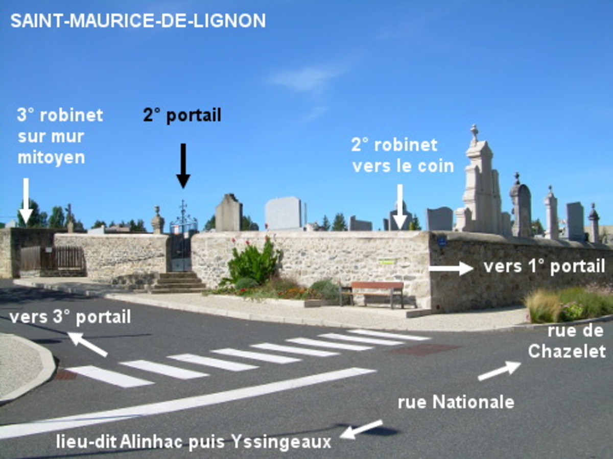 Le cimetière est implanté côté gauche à la sortie nord du village au bord de la rue principale qui le traverse. Il est composé de plusieurs parties, il comporte trois portails et trois robinets. Le robinet le plus facilement accessible est celui qui est à l'intérieur à droite du portail qui donne sur la rue principale, les deux autres donnant sur une voie adjacente. 1) En provenance de Monistrol-sur-Loire sur la D47 (au carrefour avec la bretelle d'accès à la RN88, suivre la direction du lieu-dit Pont-de-Lignon, ne pas prendre la RN88 malgré la direction de Saint-Maurice-de-Lignon !), puis la D461 (jusqu'au lieu-dit Pont-de-Lignon où l'on continue tout droit) et enfin sur la D908 (le numéro figure sur une plaque au ras du sol) en direction de Saint-Maurice-de-Lignon, qui est grosso modo parallèle à la RN88, environ 180 mètres après le panneau de début de village, juste après le panneau ''zone 30'', s'arrêter pour entrer dans la première partie du cimetière implanté côté droit (il y a une grande chapelle à l'intérieur). On trouvera le premier robinet à droite du portail (N.B. : L'eau gicle sur ce robinet-vanne). 2) En provenance d'Yssingeaux (dans le centre-ville prendre la D988 puis au premier rond-point prendre à gauche un bout de D105 en direction de Saint-Maurice-de-Lignon, ensuite au deuxième rond-point prendre la première sortie en direction du lieu-dit Alinhac) sur la petite route passant par le lieu-dit Alinhac et grosso modo parallèle à la N88, traverser presque tout le village. Juste après le mini rond-point plat il y a côté gauche un grand parking puis le cimetière derrière la voie adjacente. On voit alors face à soi l'un des deux portails donnant dans cette voie (en cul-de-sac). 2a) Si l'on entre par ce portail (à 10 mètres de la route), on trouvera un robinet à 11 mètres sur la droite (allée en herbe) sur le mur entre deux sépultures et juste avant le coin. 2b) En cas de souci, on peut chercher le troisième robinet : entrer par le dernier portail (à 45 mètres de la route) et se diriger vers la droite (allée en herbe) pour trouver ce robinet sur le mur mitoyen (à 20 mètres du dernier portail).