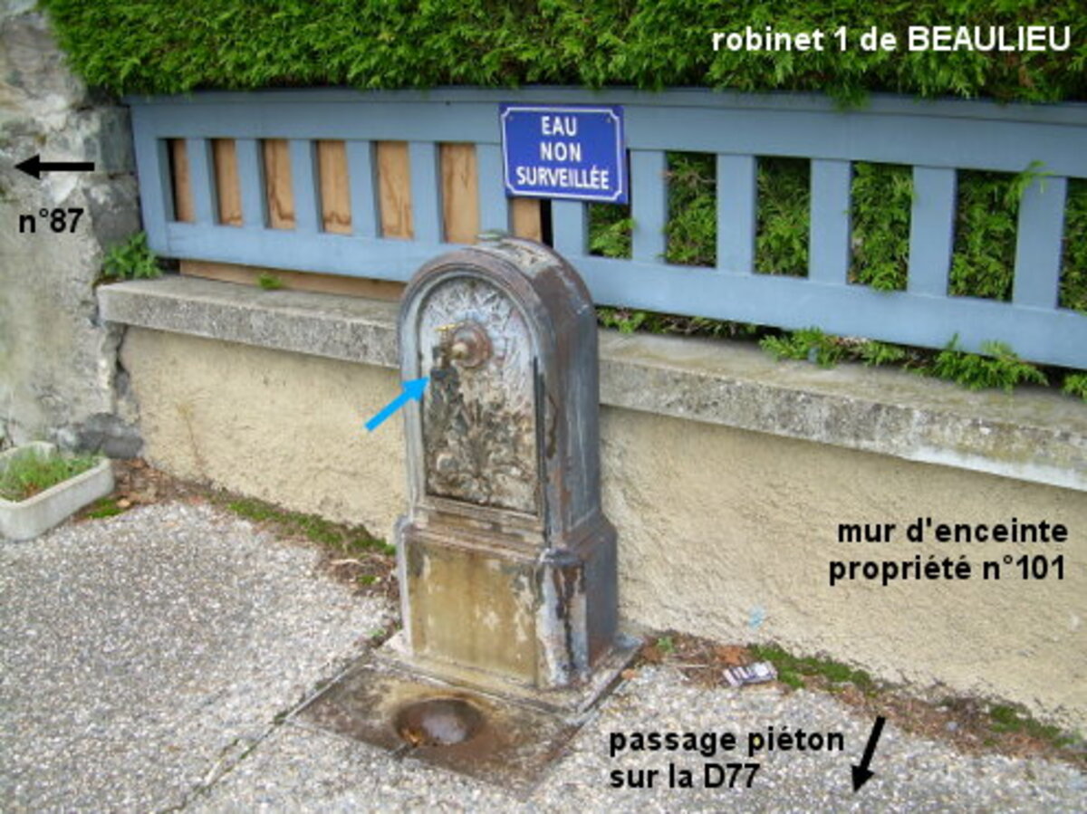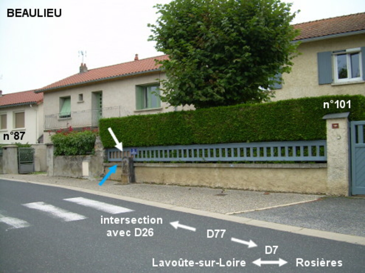 Ce robinet se trouve sur le trottoir devant le mur de la propriété sise au n°101 rue des Artisans, qui est un tronçon de la D77 situé entre la D7 (direction Lavoûte-sur-Loire ou Rosières) et l'intersection D77 / D26. AVERTISSEMENT : Ce robinet fixé sur un support en forme de borne est surmonté d'un écriteau ''eau non surveillée''. 1) Sur la Voie Verte ''Via Fluvia'' en provenance de Lavoûte-sur-Loire, à l'intersection avec une rue où l'on voit une petite flèche ''accès bourg Beaulieu'' qui pointe à gauche, tourner à gauche dans ladite rue (c'est la D77) pour trouver le robinet 65 mètres plus loin côté droit, après le portail n°101 et avant le portail n°87, et face au passage piéton. 2) Sur la Via Fluvia en provenance de Rosières, en la quittant pour suivre la flèche à droite ''accès bourg Beaulieu'' on sera sur la D26. Suivre le virage à gauche avant l'église pour déboucher sur l'intersection D26 / D77. Tourner à gauche dans la D77 pour trouver le robinet côté gauche juste après le portail n°87 (numérotation métrique). 3) En provenance de Malrevers sur la D26 puis la D7 (en arrivant sur la D7 dans laquelle on tourne à droite, on voit la piste cyclable de la Via Fluvia qui longe la D7 côté gauche), tourner à gauche dans la D77 (en direction de Chamalières-sur-Loire) pour trouver le robinet côté droit après le n°101. 4) En provenance de Chamalières-sur-Loire sur la D35 puis la D77, environ 90 mètres après l'intersection avec la D26 qui est près de l'église érigée côté gauche très en retrait, on trouvera le robinet sur le côté gauche de la rue.