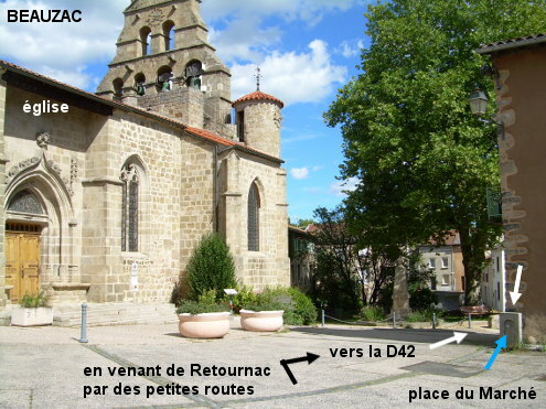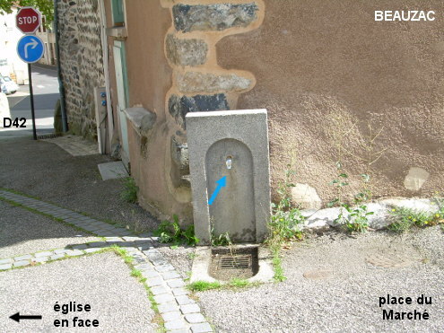 Le robinet se trouve à l'angle de la place sur laquelle se tiennent les marchés et située en face de l'église, à 20 mètres de la D42 près de son carrefour avec la D461. 1) En provenance de Retournac sur la D9 puis la D244 (au lieu-dit Charrées prendre la D244 en direction du lieu-dit Sarlanges) et enfin sur des petites routes (au carrefour en Y avec sur la branche gauche la direction du lieu-dit Sarlanges et sur la branche droite la flèche d'un itinéraire cyclo, tourner à droite dans la route de la Faneuvre en direction du lieu-dit Malfrait à côté duquel on passera, puis rouler toujours tout droit en traversant les lieux-dits Combres, La Croix Blanche et Les Granges), on arrivera dans Beauzac sans avoir vu de panneau marquant le début de la ville (par cet itinéraire alternatif à la D46 à grande circulation). Quand on sera face à une arche (avec un sens interdit les jours de marché le dimanche matin), passer sous cette arche pour déboucher sur la place du Marché avec l'église érigée côté gauche. Rejoindre le coin de cette place qui est à gauche en diagonale pour trouver le robinet sur un support vasque en pierre situé contre l'angle du bâtiment au bord de la rue qui passe devant l'église et rejoint la D42 en contrebas sur un carrefour dont on voit le panneau stop. 2) En provenance de Beaux sur la D42, juste avant le carrefour à droite avec la D461 en direction du lieu-dit Pont-de-Lignon (dont le début est en sens unique), juste après l'arche piétonne côté gauche, tourner à gauche dans la courte rue qui monte vers l'église que l'on voit déjà. Le robinet est à gauche à l'angle avec la deuxième place (la première étant côté droit avec le Monument aux Morts juste avant l'église).