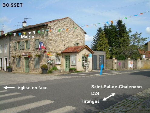 Les toilettes se trouvent au bord de la D24 direction Saint-Pal-de-Chalencon, à côté d'une ancienne bascule, à côté du pignon droit de la Mairie et à proximité de l'église. Il s'agit d'une cabine WC autonettoyante, avec ici un bouton-poussoir pour la commande de l'écoulement de l'eau. N.B. : Il y a aussi un robinet à l'extérieur, à gauche de la cabine WC, fixé sur le mur du bâtiment de l'ancienne bascule. 1) En provenance de Saint-Pal-de-Chalencon sur la D24, peu avant l'église érigée côté droit, on verra la cabine WC côté droit juste avant le petit bâtiment d'une ancienne bascule situé dans l'angle de la rue adjacente à droite qui passe devant la Mairie (dont la façade est orientée face au sens inverse) qui est sise elle aussi dans l'angle de ce carrefour. 2) En provenance de Tiranges sur la D24, après le carrefour à gauche avec la D44 venant de Craponne-sur-Arzon, juste après l'église érigée côté gauche, on verra la façade avant de la Mairie derrière le carrefour avec la rue adjacente à gauche. La cabine WC se trouve à droite de la Mairie et au bord de la D24, coincée entre le petit bâtiment de l'ancienne bascule et le mur d'une propriété voisine.