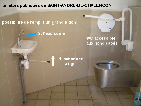 Les toilettes se trouvent entre la Mairie et l'église, à proximité de la D29. En provenance de Saint-Maurice-de-Roche sur la D29, au carrefour en T où la D29 continue sur la gauche, et où sur la droite on voit quelques mètres plus loin la Mairie, tourner à droite. Passer devant la Mairie sise à gauche de la route, qui fait une courbe, pour trouver le petit bâtiment des toilettes au fond de la placette située à droite de la Mairie, et accolé à une partie de l'église. La porte des toilettes, sur le côté droit, s'ouvre sur une grande cabine WC accessible aux handicapés, avec pour la commande de l'écoulement de l'eau dans le lavabo une tige souple positionnée sous le lavabo.