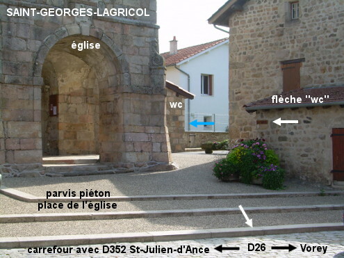Ces toilettes sont accolées à droite de l'église érigée au bord de la D26. N.B. : Il n'y a pas de lavabo, mais un robinet avec un long tuyau fixé en hauteur à droite des urinoirs, dans le coin à droite de l'entrée. 1) En provenance de Saint-Julien-d'Ance sur la D352, au carrefour en T avec la D26 tourner à gauche (en direction du centre du village, et de Retournac). Peu après le carrefour où la D26 fait un angle droit vers la gauche, on arrivera vers l'église érigée côté gauche. Entrer sur le parvis piéton de l'église et en suivant l'indication de la petite flèche en bois placée sur un bâtiment situé à droite du parvis, se diriger vers le petit bâtiment en pierres des toilettes accolé à droite de l'église, et au bout d'une impasse qui arrive par derrière (en provenance d'une rue secondaire). 2) En provenance de Saint-Pierre-du-Champ sur la D35 puis la D26 (à l'intersection avec la D9, faire gauche/droite pour prendre la suite de la D26 qui n'est pas pile en face), entrer à droite sur le parvis de l'église et passer à sa droite pour trouver les toilettes au fond (à 20 mètres de la D26).
