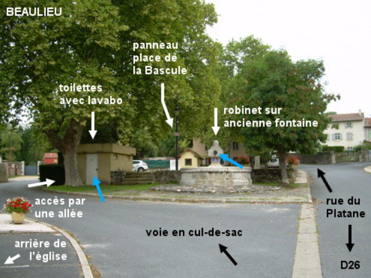Les toilettes et ce robinet monté sur une ancienne fontaine se trouvent à proximité de l'arrière de l'église qui est érigée près de l'intersection D26 / D77. 1) En provenance de Vorey-sur-Arzon sur la D103 puis la D26, à l'intersection avec la D77 on verra l'église côté gauche en retrait après ce carrefour, son portail nous faisant face. Continuer tout droit dans la D26 puis tourner à gauche (rue du Platane). 1a) Juste après on verra côté gauche dans la fourche d'un carrefour en Y le grand bassin circulaire d'une fontaine. Un robinet-papillon est installé sur cette ancienne fontaine. AVERTISSEMENT : Il est surmonté d'un écriteau ''eau non surveillée''. 1b) À gauche de l'ancienne fontaine située dans la fourche du carrefour en Y, on verra le petit bâtiment des toilettes (à 110 mètres de l'intersection D26 / D77) accessible par la branche gauche dudit carrefour. N.B. : Le grand lavabo se trouve dans la cabine WC. 2) En provenance de Rosières sur la D7, tourner à droite dans la D26 puis quand on arrive en vue de l'arrière de l'église, tourner à droite pour voir juste après les toilettes et l'ancienne fontaine dans la fourche d'un carrefour en Y derrière lequel il y a une grande place en terre battue.