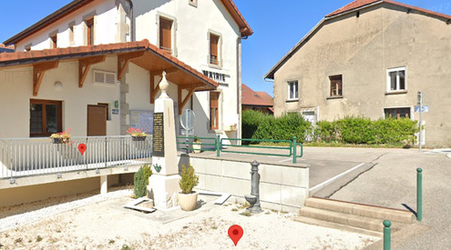 Sur la gauche en montant, devant le monument aux morts à côté de la mairie