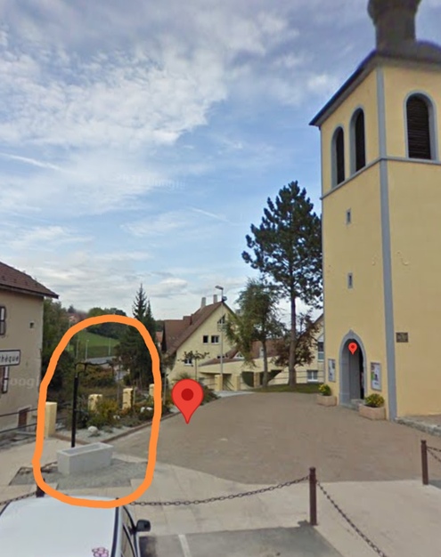 La fontaine ressemble à une potence, sur la place de l'église, un robinet poussoir est accessible sur le côté droit.