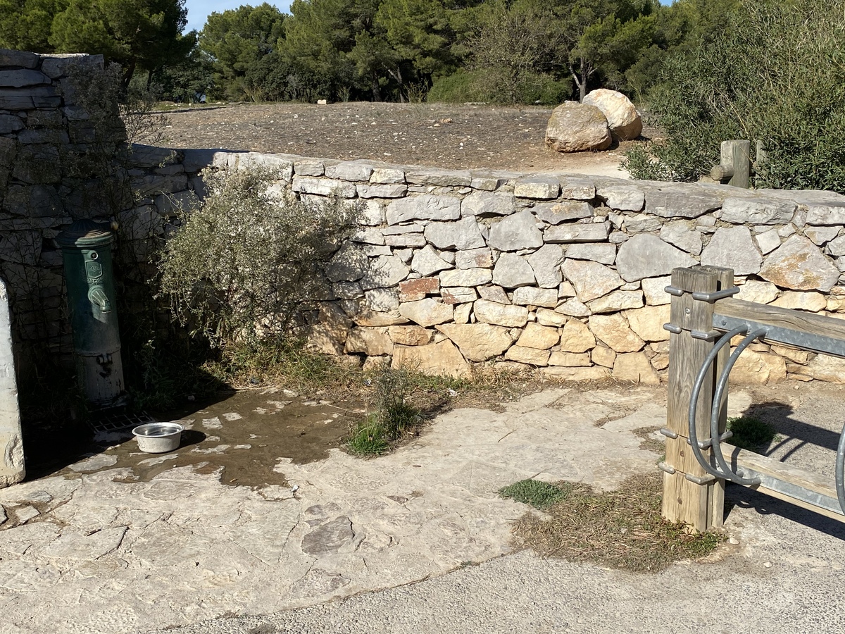La fontaine se trouve au bout de l'allée, à droite du passage au site des Pierres Blanches.