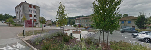 Une borne verte se trouve sur la place récemment refaite, à côté d'une fontaine, sur la D20 Route de Montfalcon / Avenue de Lusy Pelissac.