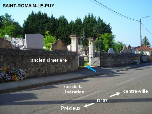 L'ancien cimetière est situé en ville quasiment en face du point kilométrique 4 de la D107. En provenance de Précieux par la D107, suivre la direction de Saint-Romain centre et Saint-Georges-Haute-Ville. Le cimetière est implanté côté gauche peu avant l'intersection D107 / D95. Entrer par le portail de gauche (l'autre est fermé), le robinet est à l'intérieur, à droite de ce premier portail. N.B.: Les horaires d'ouverture du cimetière sont: de 8h à 20h d'avril à octobre, et de 8h à 17h30 de novembre à mars.
