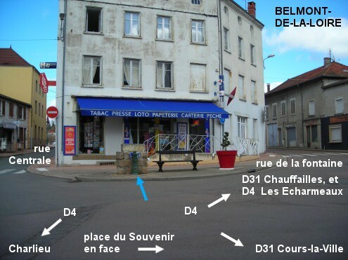 La borne Bayard est implantée au bord de la D4 au centre du village, en face de l'intersection sud avec la D31 (direction Cours-la-Ville). Sur la D4 en provenance de Charlieu, quand on arrive à un grand carrefour sur le replat après la montée vers le centre du village, on verra sur la droite la D31 direction Cours-la-Ville, en face la grande place du Souvenir, immédiatement sur la gauche deux rues dont une en sens interdit (la rue Centrale) et juste après sur la gauche la suite de la D4 (rue de la fontaine) en direction des Echarmeaux et à partir de laquelle on peut rejoindre la suite de la D31 direction Chauffailles. La borne se trouve sur le bout de trottoir à gauche, entre la rue Centrale et la rue de la fontaine (devant un tabac presse qui a actuellement un auvent bleu roy). N.B. : Sur le muret en pierre du bac à fleurs surélevé derrière la borne il y a un écriteau bleu ''eau potable''.