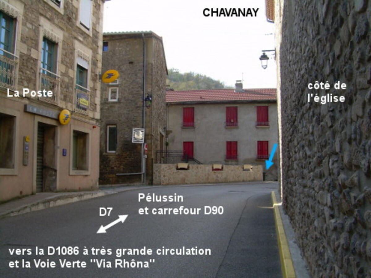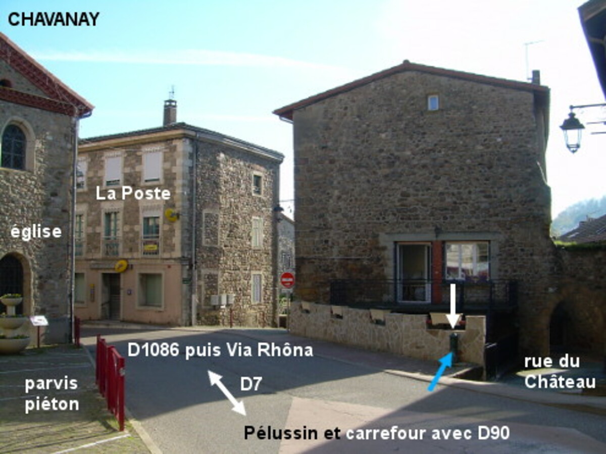 La borne se trouve sur un trottoir presque en regard du côté de l'église érigée au bord de la D7, et à proximité du bureau de Poste. N.B. : Sur cette borne Bayard, tourner la molette droite vers l'arrière (sens horaire) pour faire couler l'eau (on entend aussitôt le bruit du mécanisme qui fait monter l'eau qui se met à couler), et ensuite ramener la molette vers l'avant pour couper l'eau. 1) En provenance de Chuyer sur la D30 puis la D90, au carrefour en T avec la D7 (qui arrivait à droite de Pélussin) tourner à gauche (direction Condrieu). Peu après on verra la face avant de l'église érigée côté gauche, on trouvera alors la borne de l'autre côté de la D7 et entre deux rues adjacentes, peu avant le bureau de Poste. 2) À partir de la Voie Verte ''Via Rhôna'' en provenance de Condrieu, peu avant les deux très hauts piliers qui étaient à l'entrée d'un ancien pont sur le Rhône côté gauche, prendre à droite la bretelle de sortie en direction de Chavanay et ses commerces. Suivre le virage à droite, franchir la passerelle, traverser l'intersection avec une rue secondaire, tourner à droite puis plus loin à gauche toujours en suivant le fléchage destiné aux cyclistes. Après le pont sous la voie ferrée on débouchera du chemin des Lones sur une portion urbaine de la D1086 à très grande circulation. Tourner à gauche (en direction du centre-ville) puis après les deuxièmes feux tricolores tourner à droite dans la D7 en direction du centre-ville. Rouler tout droit jusqu'à l'église érigée côté droit. À cet endroit, côté gauche on verra le bureau de Poste dans l'angle d'une rue adjacente en sens interdit puis on découvrira la borne sur le trottoir avant la rue adjacente suivante toute proche.